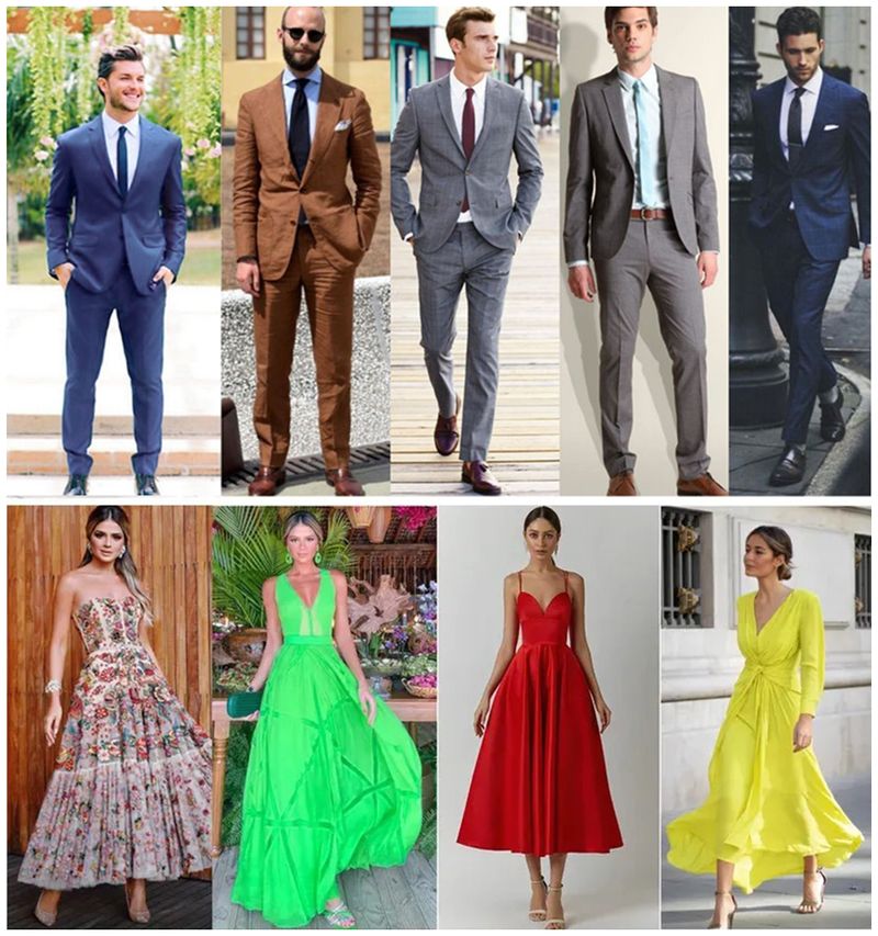 Mulheres: Vestido longo ou midi, conforme preferência. Pode ser liso ou com um pouco de brilho (tecidos fluidos ou estruturados). Como a cerimônia será em um ambiente gramado, sugerimos evitar sapatos ou sandálias com salto fino.